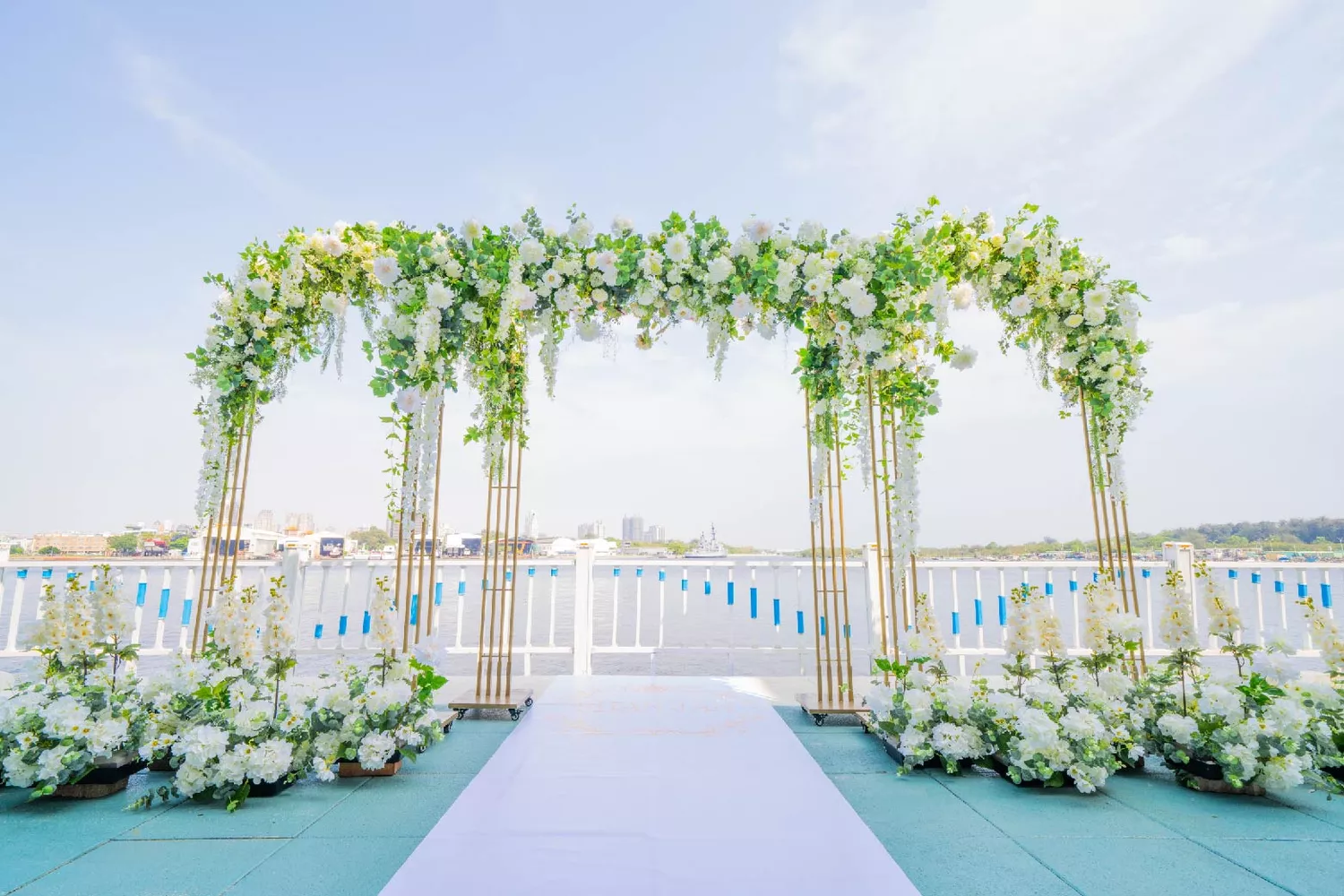 專屬打造的浪漫花藝拱門,象徵著通往幸福的入口。精緻的花藝佈置,讓每一張照片都如畫般美麗,是證婚儀式最完美的焦點。